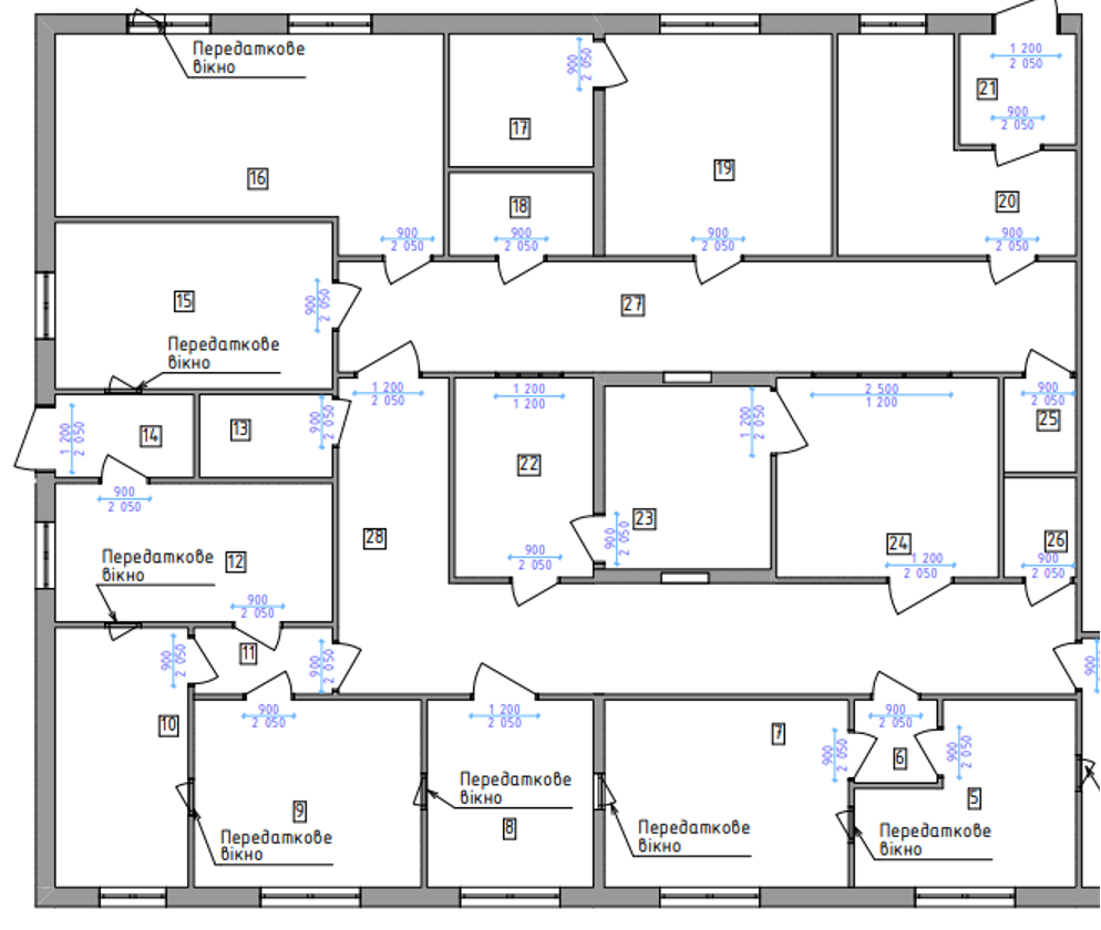 Двері приміщень "заразної" зони повинні бути герметичними. Двері повинні бути оснащені спеціальними прокладками, щоб забезпечити повну герметичність. У лабораторії рекомендовано встановлювати двері без порогів, у цілях безпеки при переміщенні з лабораторним посудом. Розміри дверних отворів мають бути не менше 900 мм, а вхідних 1200 мм. Комплектація дверей повинна передбачати можливість використання електронних замків, для обмеженого доступу працівників між відділами чи кімнатами лабораторії. Всі двері у лабораторії повинні самозакриватися і замикитись.